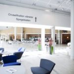 Large glass panels and skylights make Marmorfoajén a bright, open and central hub within the building.